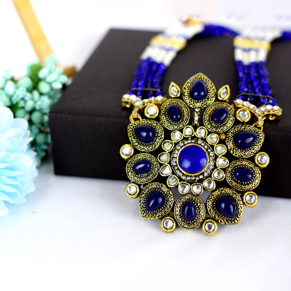 The necklace is a statement piece that sits elegantly on the neckline, drawing attention with its bold yet graceful design. It features a classic Kundan setting, where the polished blue gemstones are surrounded by intricate metal detailing, giving it a timeless appeal. The craftsmanship highlights the traditional Kundan art form, which has been a part of Indian jewelry heritage for centuries. The golden finish adds warmth to the overall design, complementing the cool blue tones of the gemstones.