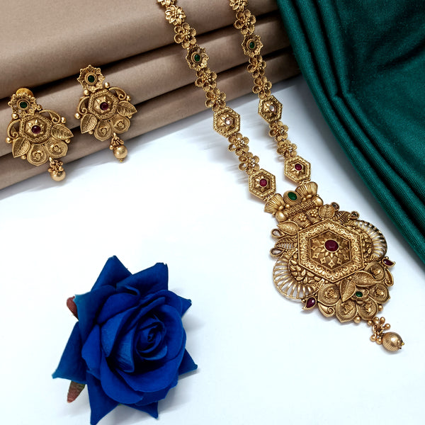 The red green antique gold plated jewellery set exudes timeless charm and sophistication. The combination of rich red and green stones with the antique gold finish creates a striking contrast that is both opulent and elegant. The intricate detailing and traditional design elements make this set ideal for special occasions and cultural celebrations.