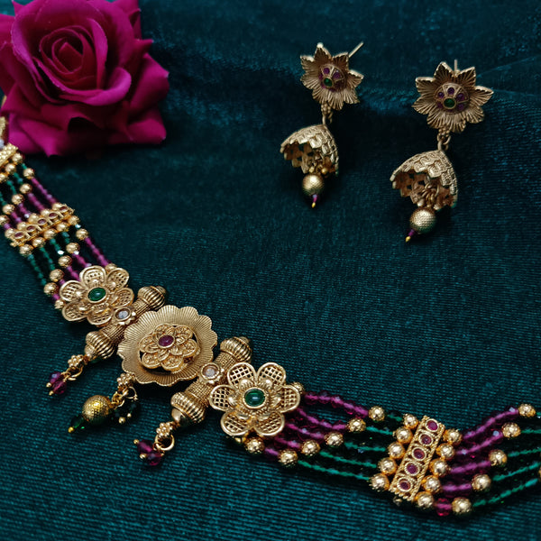 The “South Indian Choker Jewellery Set” exudes classic elegance and cultural richness. The choker’s detailed design and the matching earrings create a regal and sophisticated look, reflecting the grandeur of traditional South Indian jewelry. The intricate patterns and vibrant stones add to the set’s luxurious and ornate appeal.